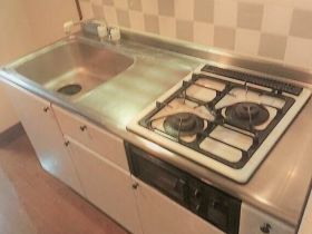 こちらのお部屋のキッチンは2口ガスコンロ、グリル付き、まな板置き場もあり!