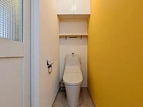 お手洗いの壁はアクセントカラーがイエローで明るい感じです